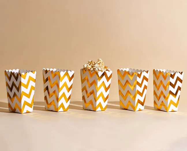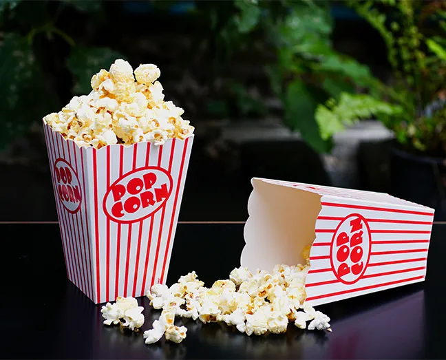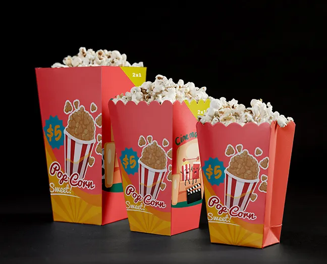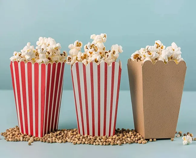 Our popcorn boxes are made from premium SBS or kraft paperboard, with optional PE coating for grease and moisture resistance.
